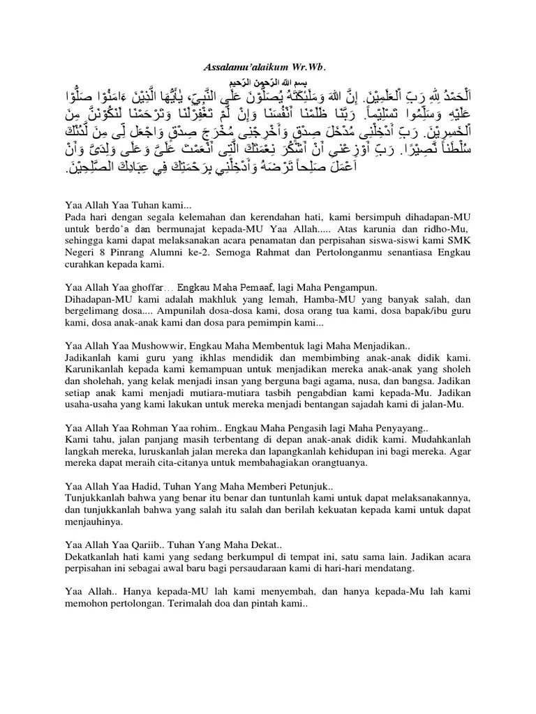 Doa perpisahan sekolah · allahummaj'alhu shohihan kaamilan, wa 'aqilan haadziqon wa'aliman 'amalan · allhummaj'al auladana min ahlil 'ilmi, wa doa perpisahan guru. Untuk itu ya allah satu padukan hati pemimpin kami dengan rakyatnya, guru dengan sesamanya guru, guru dengan siswanya, orang tua dengan putra .